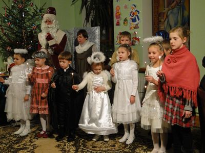 Задорная ведущая - Алеся Адамович; мудрый, добрый и веселый Дед Мороз - Павел Костюченко; ласковая, озорная, сияющая, как снежинка в лучах солнца Мария Кравчук – Снегурочка сумели придать празднику искрящуюся весельем непринужденную атмосферу. А разве может быть праздник без задорных игр, загадок-ловушек, новогодней пляски деда Мороза и Снегурочки, хороводов у елки? Нет, не может! Поэтому здесь так много шутили, говорили скороговорки, сочиняли стихи, играли, водили хороводы с новогодними песнями и танцами у переливающейся разноцветными огоньками рождественской елки. А в конце вечера Дед Мороз и Снегурочка раздали подарки малышам.