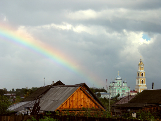 Дивеево - это действительно чудное место. Выехали мы в Дивеево субботу 9 августа. Всю дорогу от Москвы лил дождь. Как только приехали в Дивеево, начался сильнейший ливень, продолжавшийся два часа. Около 5 часов вечера, незадолго до начала Всенощной, ливень резко прекратился, небо очистилось, засветило солнце, и над Серафимо-Дивеевской Лаврой появилась радуга, приветствуя всех, идущих к обители. |