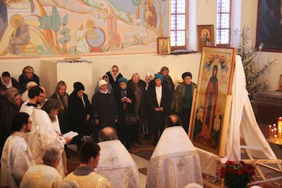 Богослужение началось с важного для нашего храма события - перенесения в верхний придел храма новой иконы преподобной Евфросинии, игуменьи Полоцкой