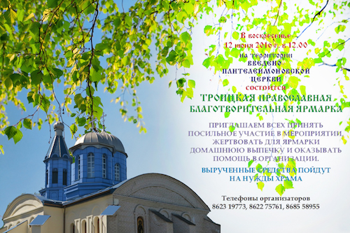12 июня в преддверии празднования Святой Троицы на территории у Введено-Пантелеимоновского храма состоится православная благотворительная ярмарка. Ярмарка обещает быть радостной. Почему? Потому что будет весело и вкусно. Конечно, будут свежие пирожки и пышные булочки, ароматный чай, но не хлебом единым… Молодежь готовит концертную и игровую программы, а мастера-умельцы предложат свои художественные изделия.