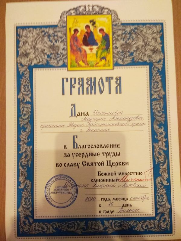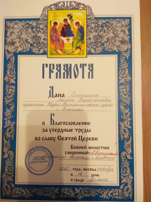 Не так давно двум нашим верным сестрам были вручены благодарственные грамоты в благословение за усердные труды во славу святой Церкви от митрополита Виленского и Литовского Иннокентия.