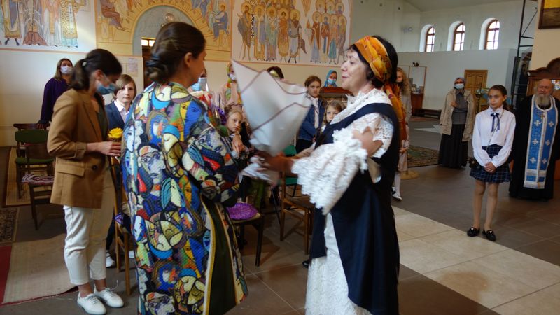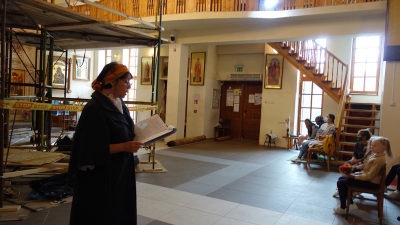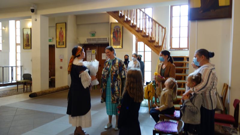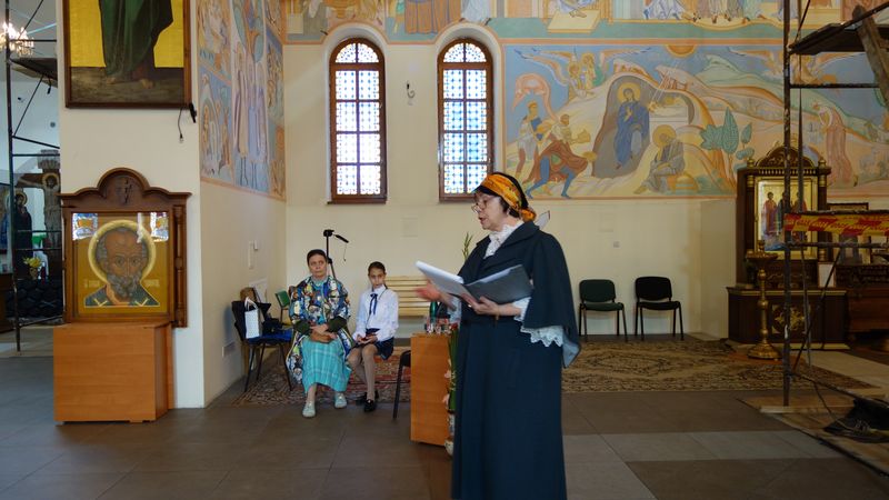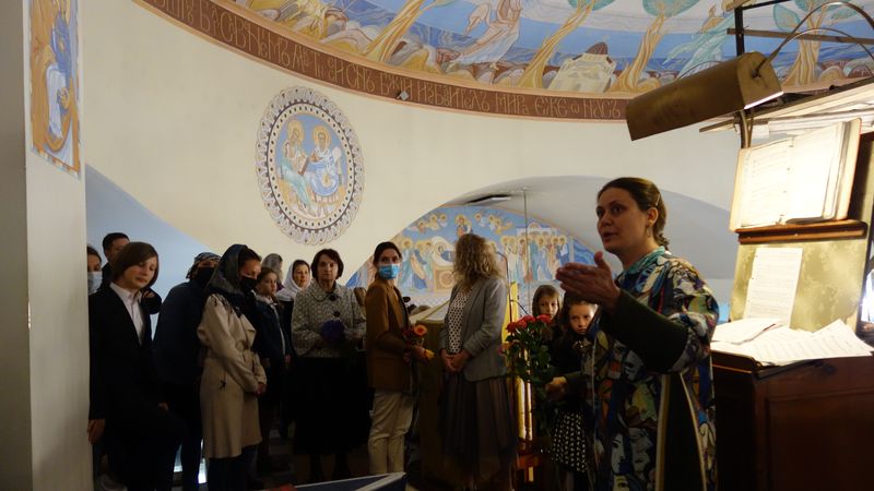 Автор настенной росписи храма Алина Князева рассказала о фресках, украшающих стены нашего храма, созданных ею, пояснила каким библейским сюжетам они посвящены. Рассказала и о предстоящих планах. И хотя рассказ больше был ориентирован на детскую аудиторию, с интересом слушали и родители.
