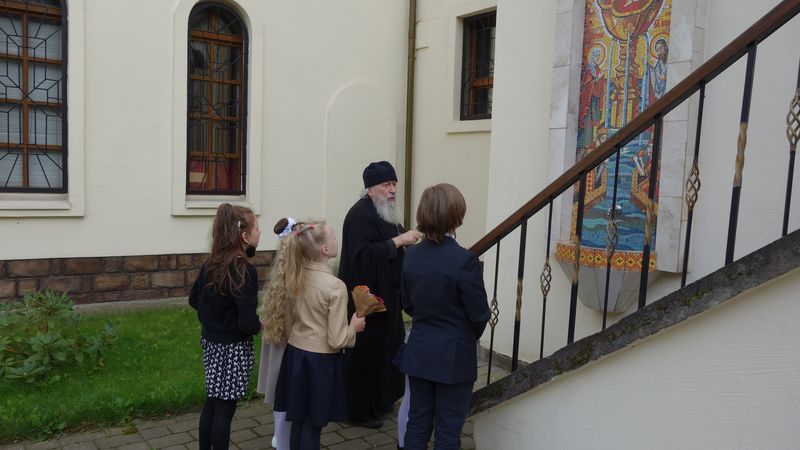 Еще во дворе храма группу гостеприимно встретил о. Иосиф. Он провел экскурсию вокруг храма, коротко рассказал об истории его строительства и о людях, благоукрашающих храм.